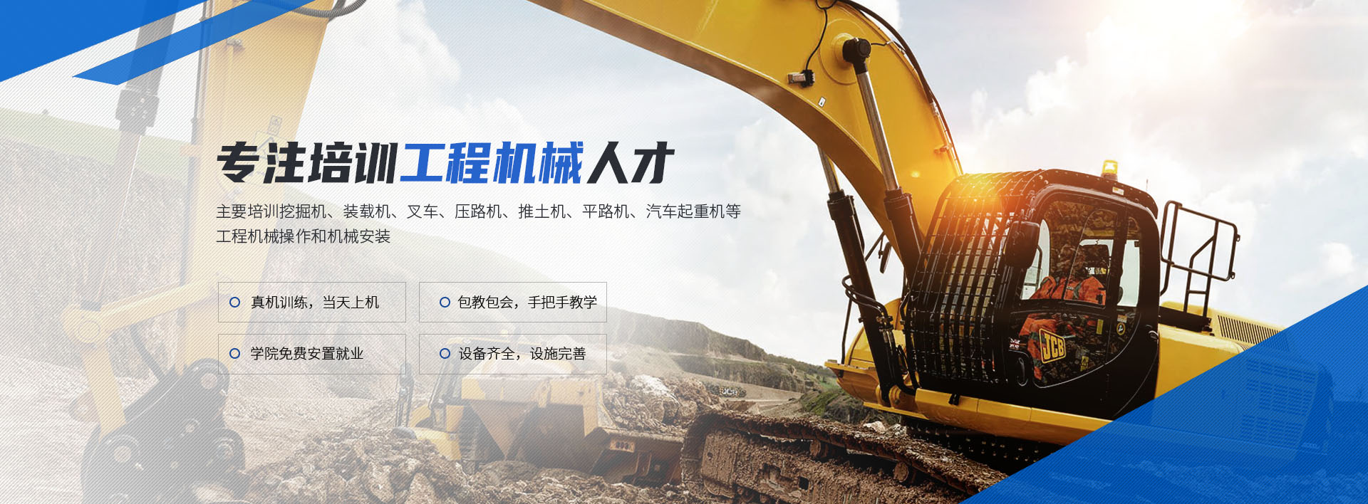 主要培训挖掘机、装载机、叉车、压路机、推土机、平路机、汽车起重机等工程机械操作和机械安装的初、中级驾驶员